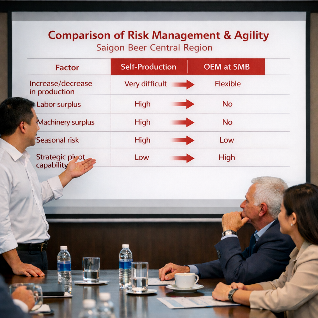 Trong ngành đồ uống, time-to-market thường quan trọng hơn việc tối ưu từng phần trăm chi phí. Một nhà máy mới mất khoảng 2 năm để hoàn thiện, trong khi OEM tại SMB chỉ cần 6–8 tuần để có sản phẩm thương mại.
